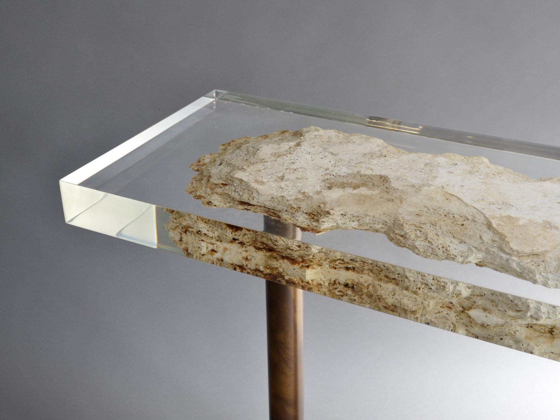 Rapolano’s Travertine Transparent Extraclear Polished Resin Burnished Steel Base.
