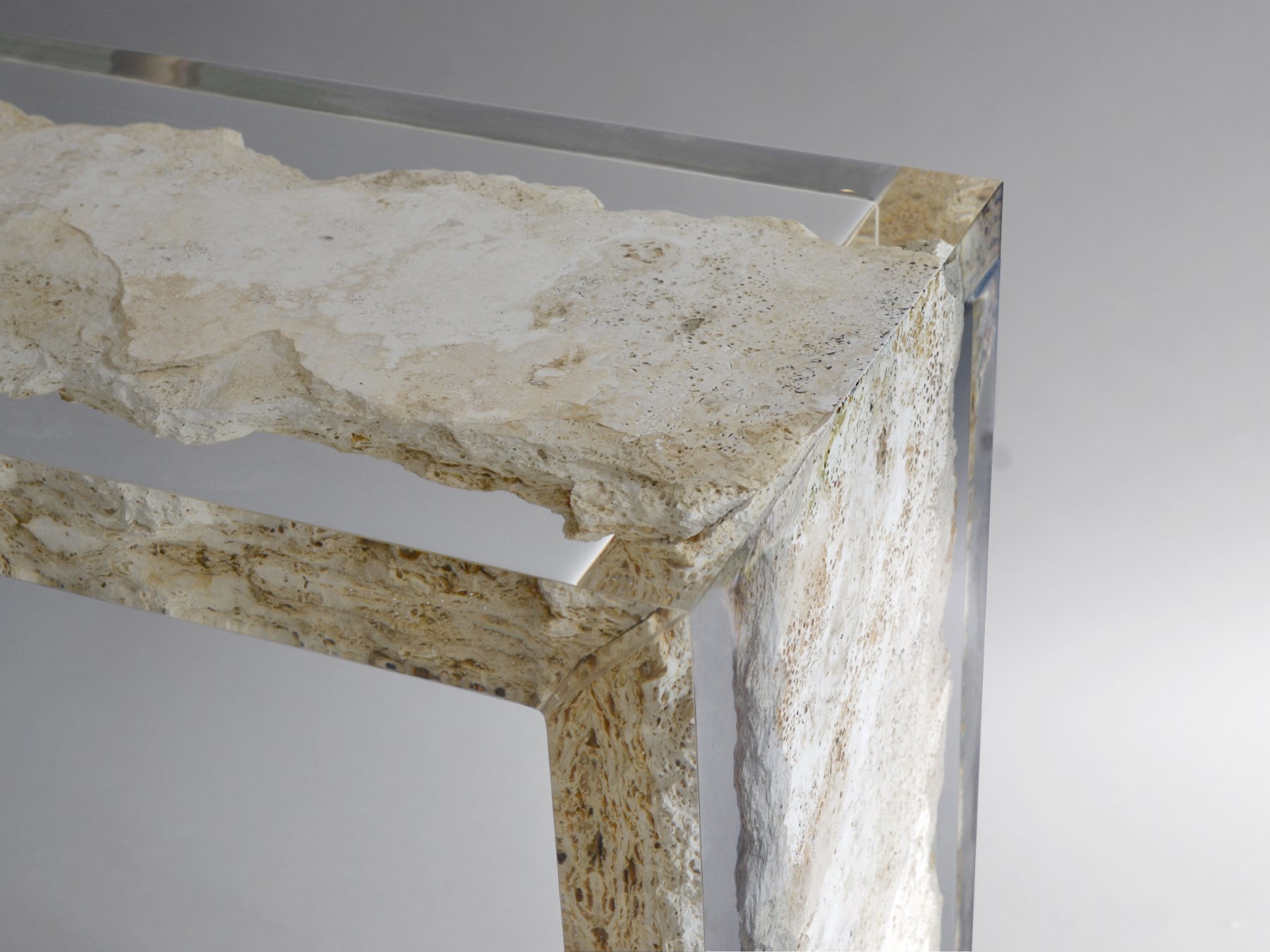 The Rapolano Console is not merely functional, it is a metaphysical composition. A fragment of earth, shaped by centuries of subterranean flow, is lifted and held aloft by a slender metal pillar: a silent, vertical presence anchoring space and time. The stone hovers in balance, between geology and geometry, memory and material, made eternal through design.