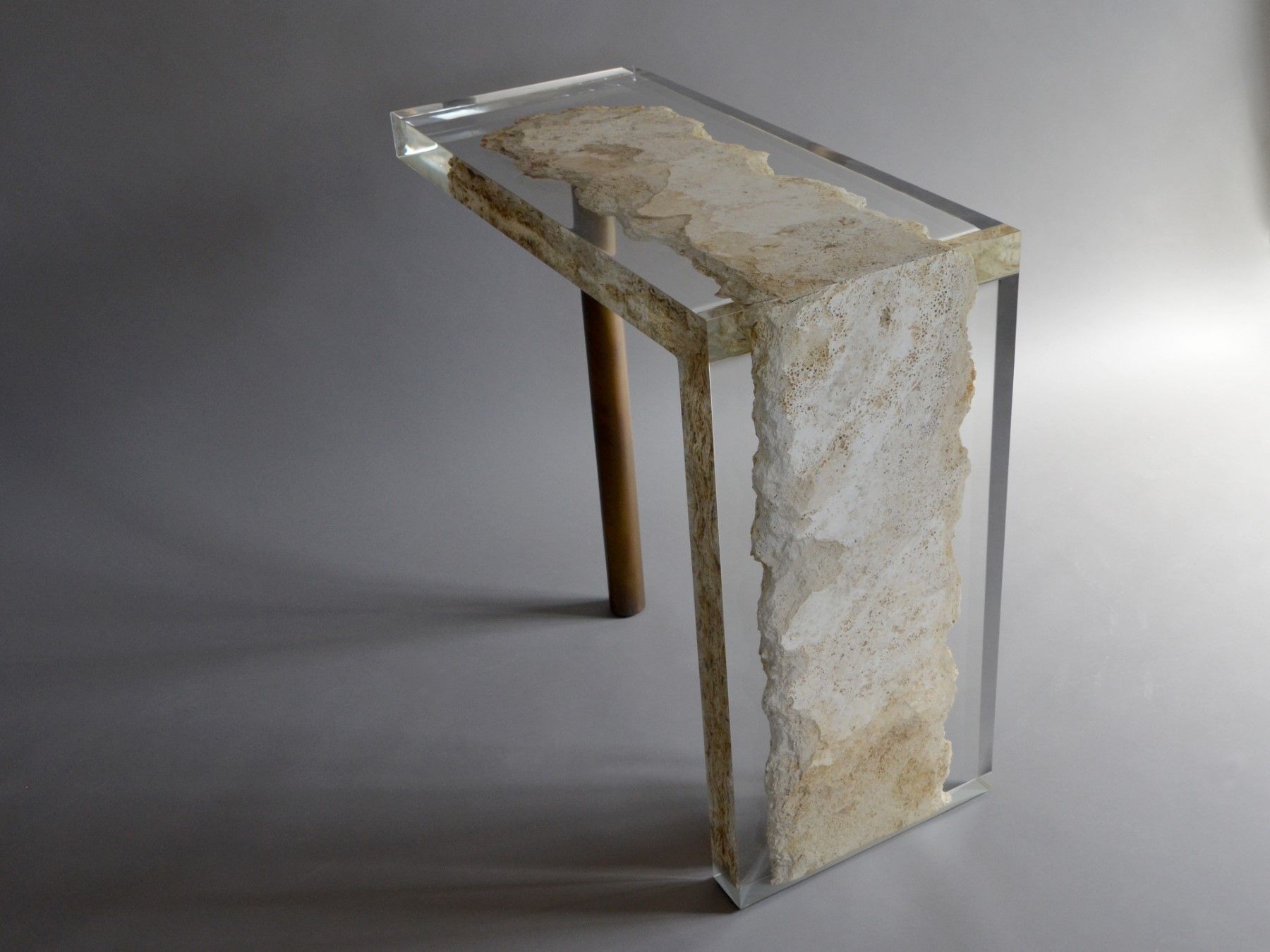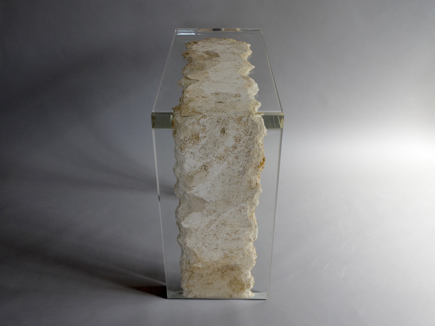 In collaboration with Vaselli, alcarol has reclaimed weathered fragments of this ancient stone, preserving its hollowed forms with a transparent resin that evokes the very waters from which it was born.