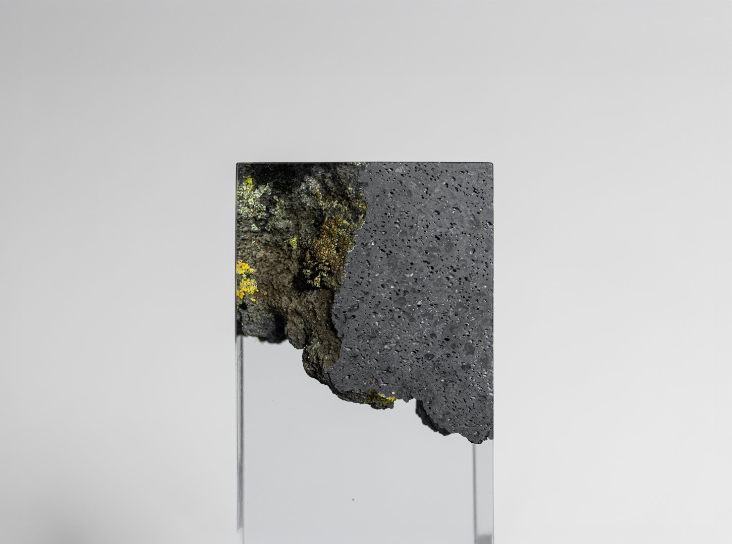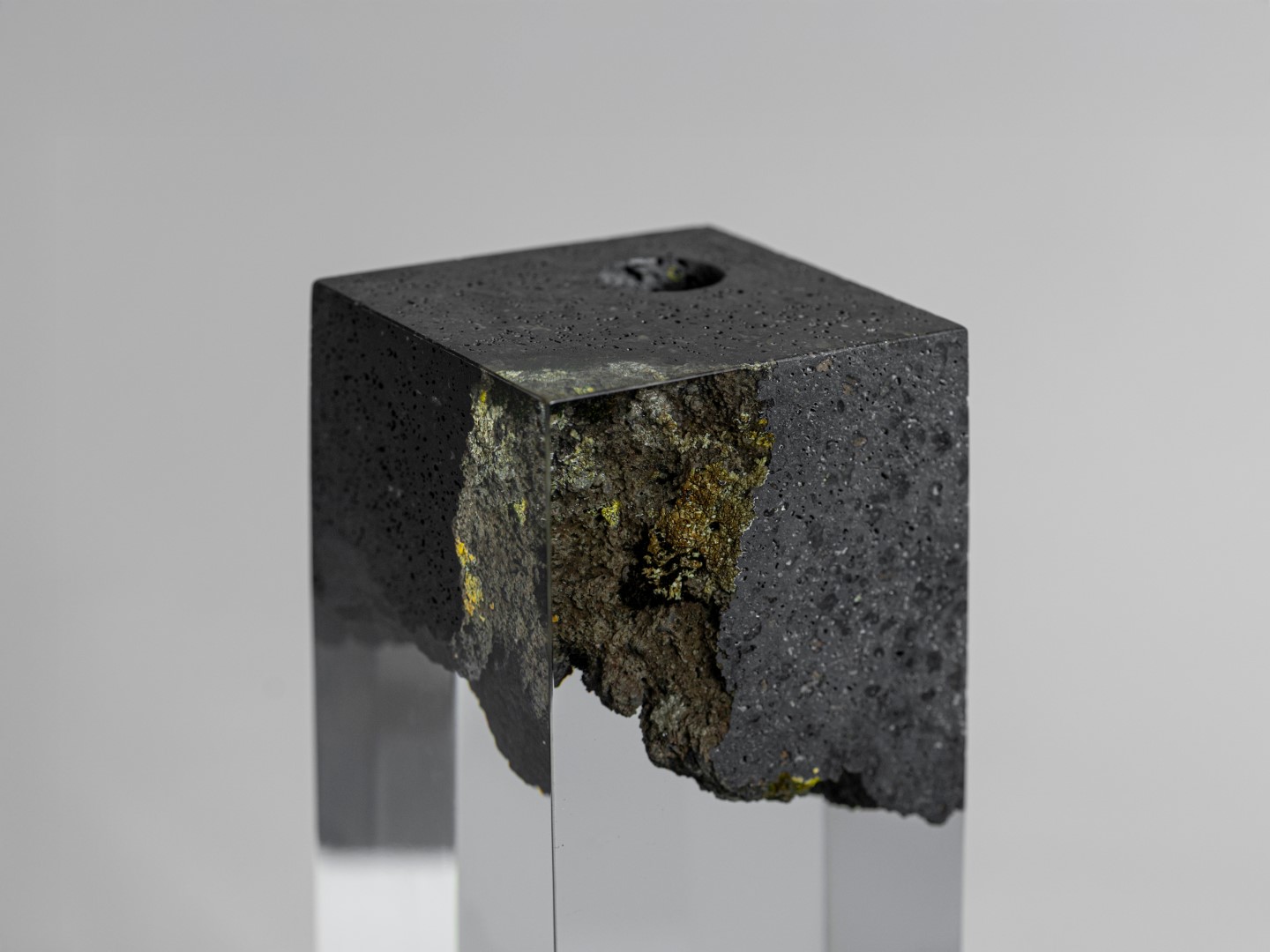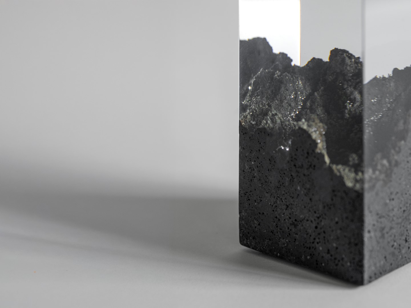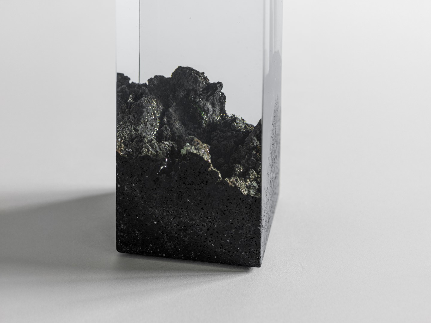 Within each piece, a micro-geography unfolds: cavities formed by escaping gases, textures defined by sudden solidification, surfaces that speak of tension between fluidity and resistance. The transparency acts as a still body of water, through which the dense core is observed.