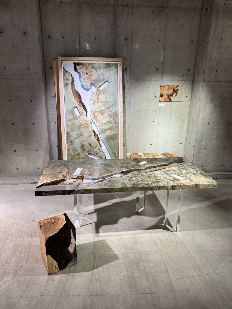 Burled Poplar Wood with Verdigris Impregnation process, Extraclear Polished Resin, Invisible metal fixings