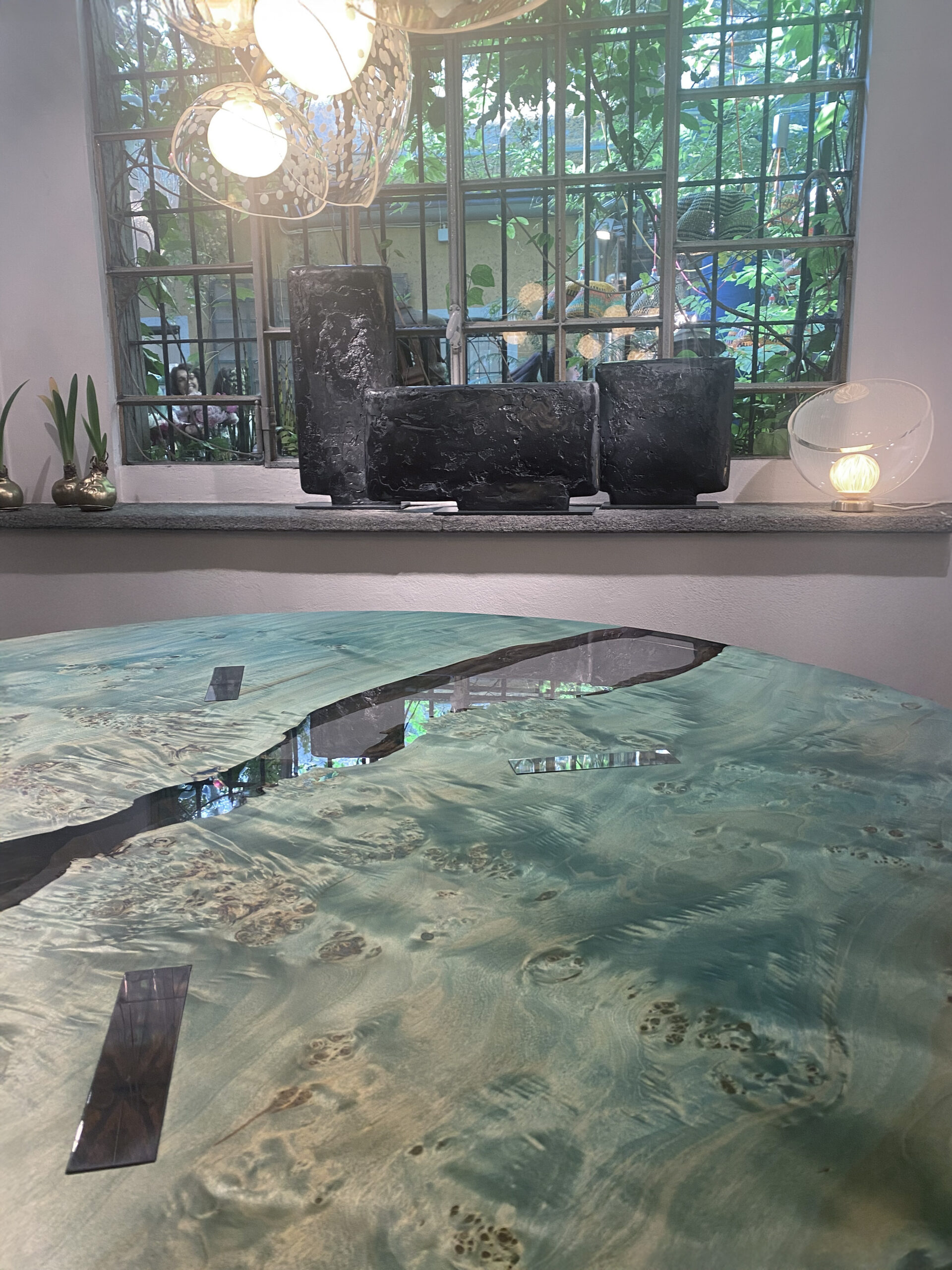 Burled poplar wood with verdigris impregnation process, extraclear polished resin, invisible metal fixings