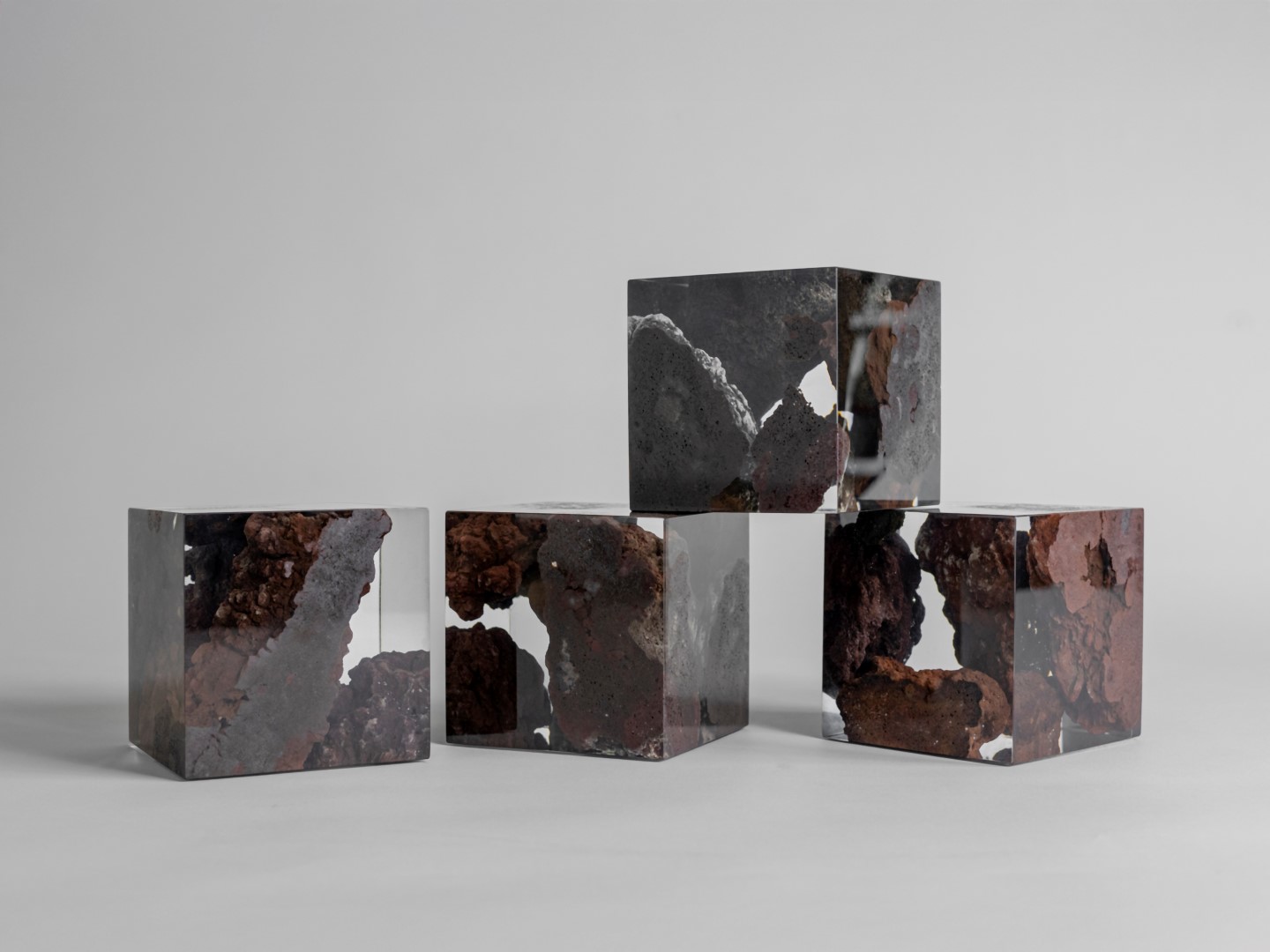 Erosion and cooling, pressure and release: the pieces hold within them the memory of these opposing forces. The resin preserves this moment as a suspended environment, where density and fluidity coexist.