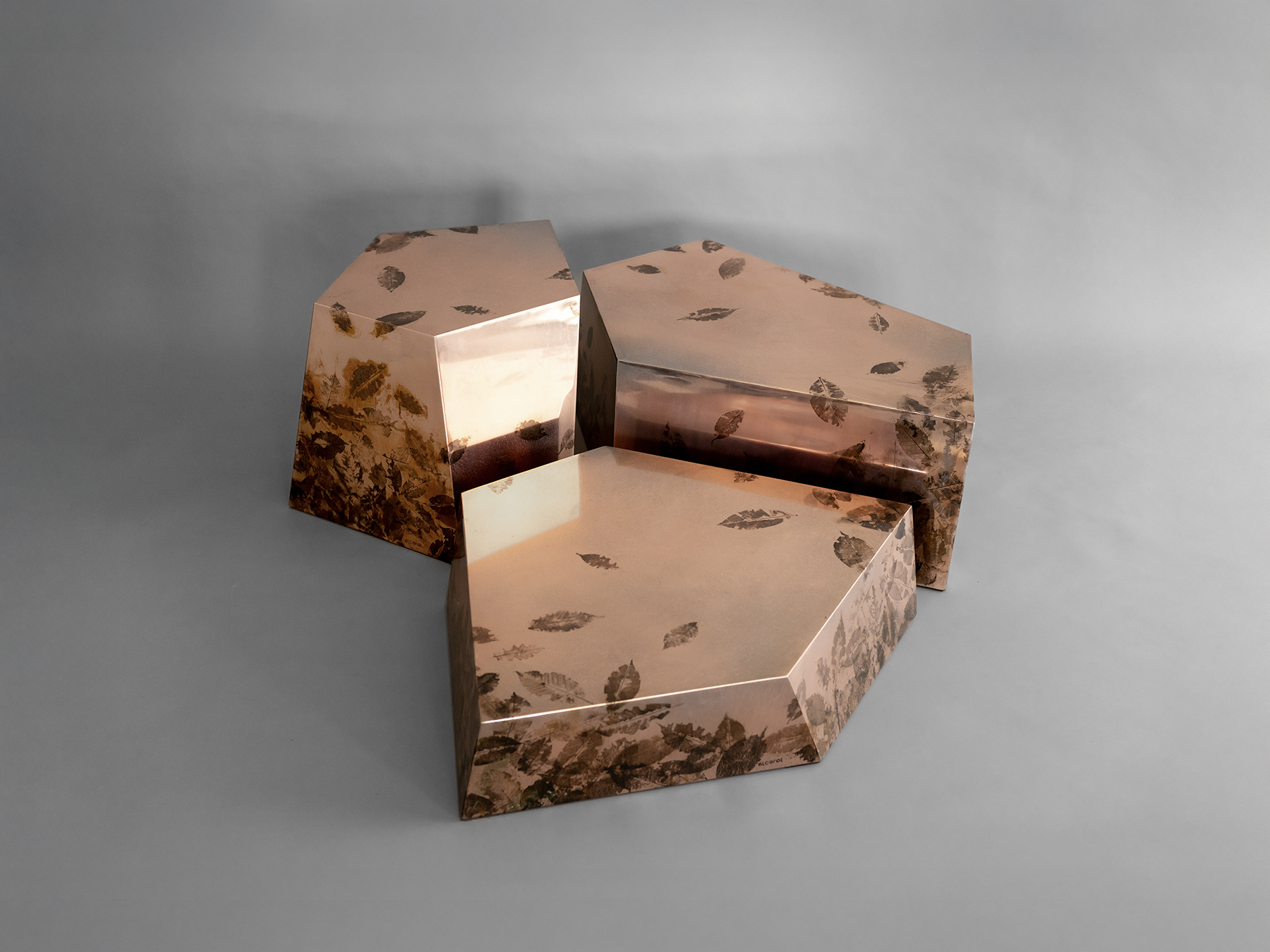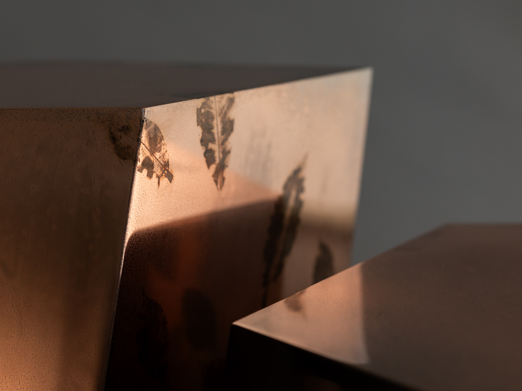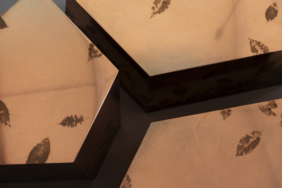 The mirrored copper surfaces, marked by organic imprints, play with light and depth, producing a dynamic effect that shifts with the gaze and surrounding environment.