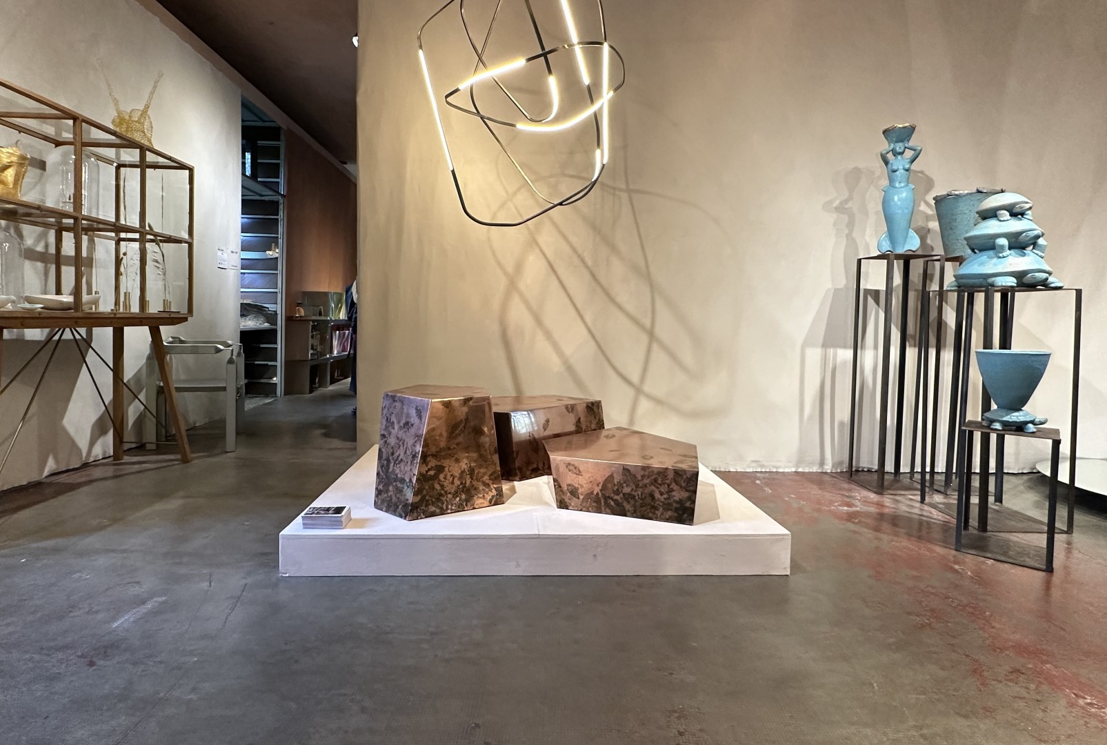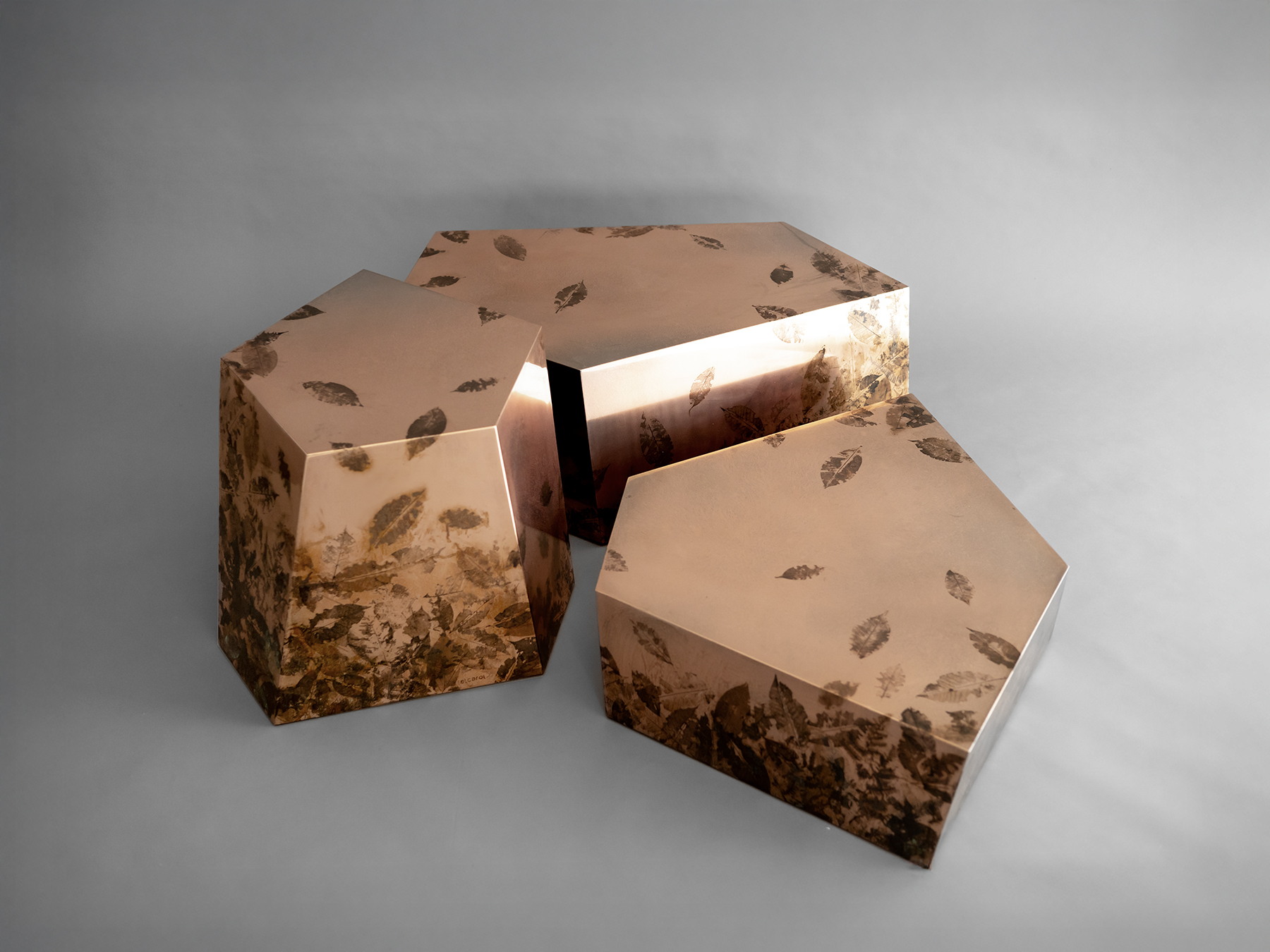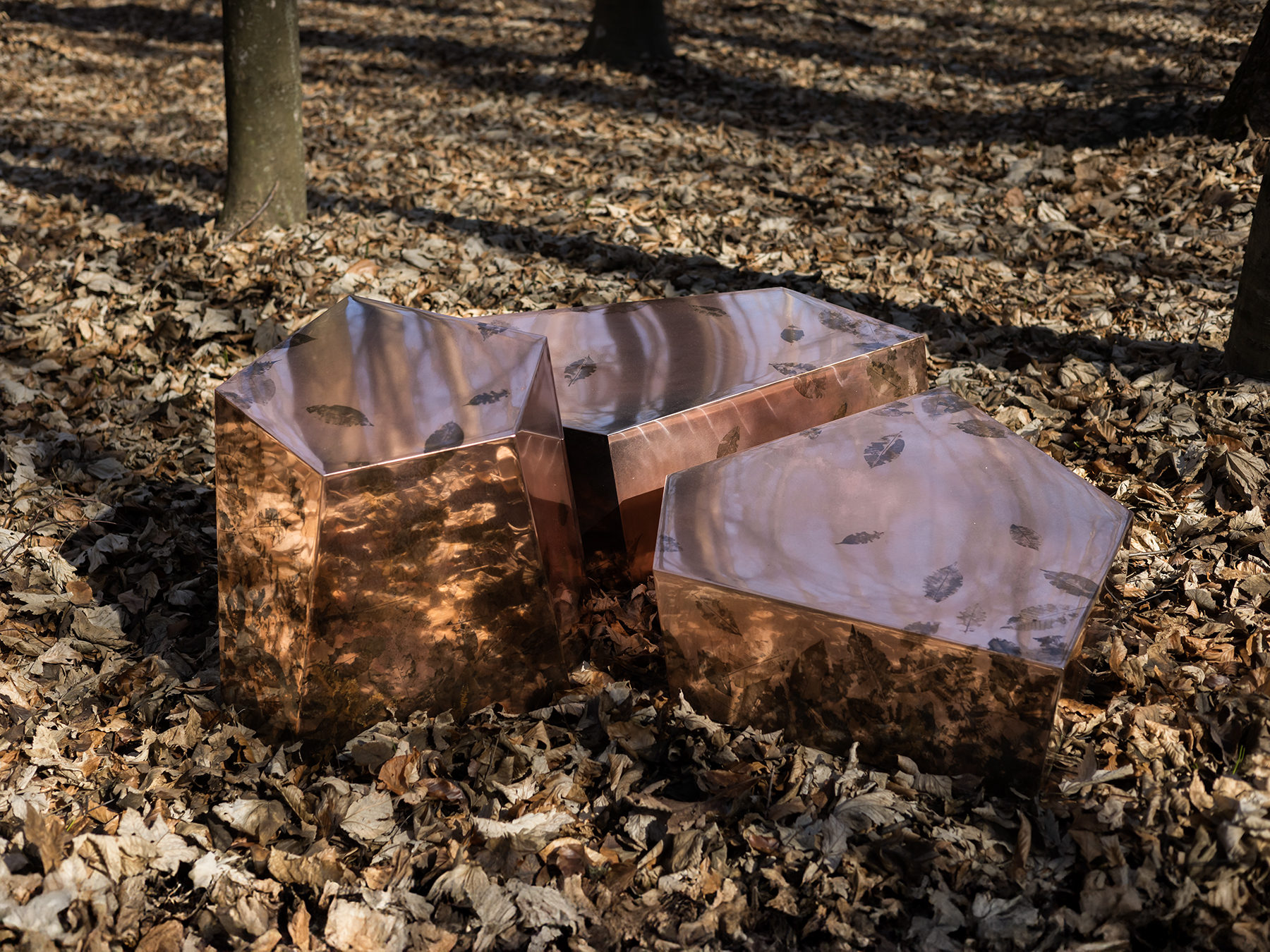 The mirrored copper surfaces, marked by organic imprints, play with light and depth, producing a dynamic effect that shifts with the gaze and surrounding environment.
