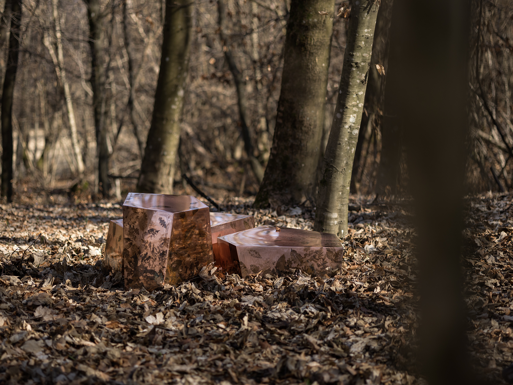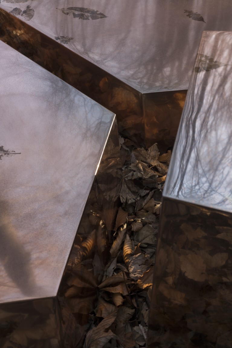 A trio of mirrored metal objects, seemingly imprinted by a long stay in the forest and shrouded in ancestral mystery, embodies the timeless dialogue between the fleeting nature of the organic world and the apparent eternity of inorganic matter.