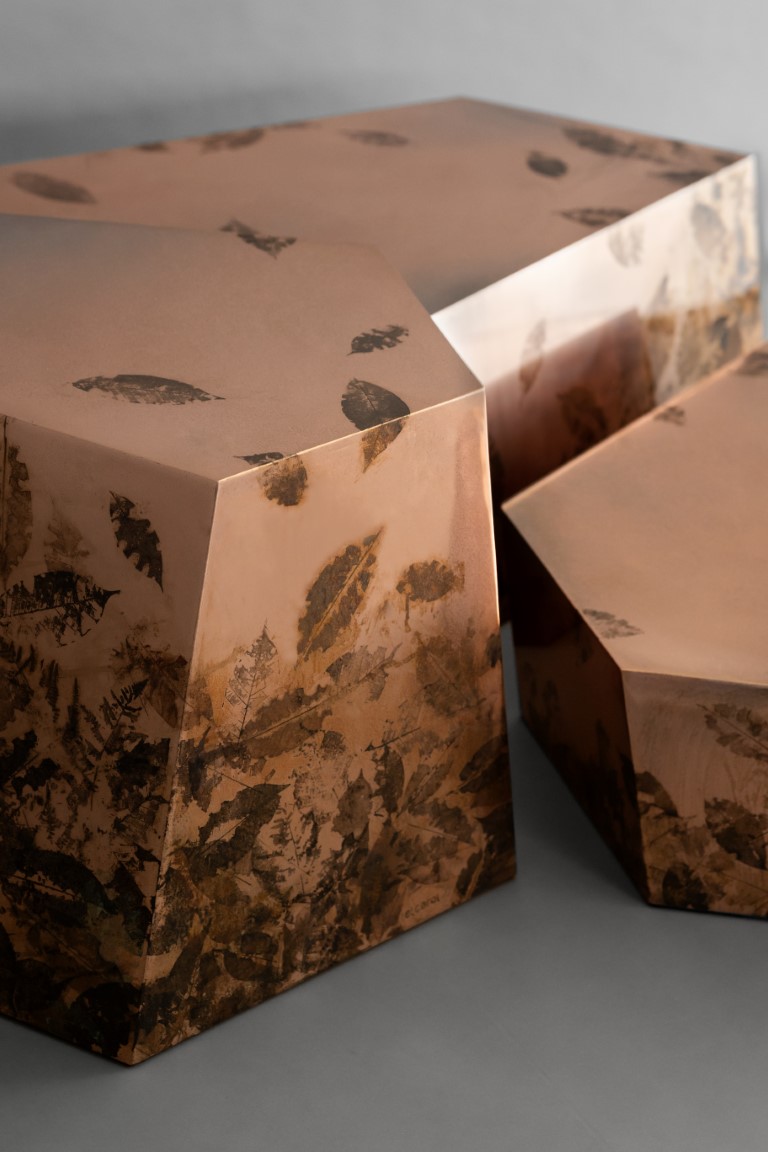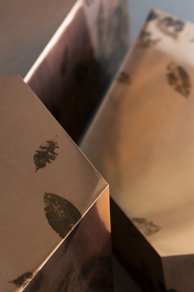 The plant world is rich in tannins, natural compounds that react with metals to form oxides and surface patinas. Real leaves and underwood plant fragments are immersed in tannin-based solutions and oxidizing agents to accelerate and control natural oxidation, interacting with the metal to create one-of-a-kind textures and patinas with organic, ever-changing hues.