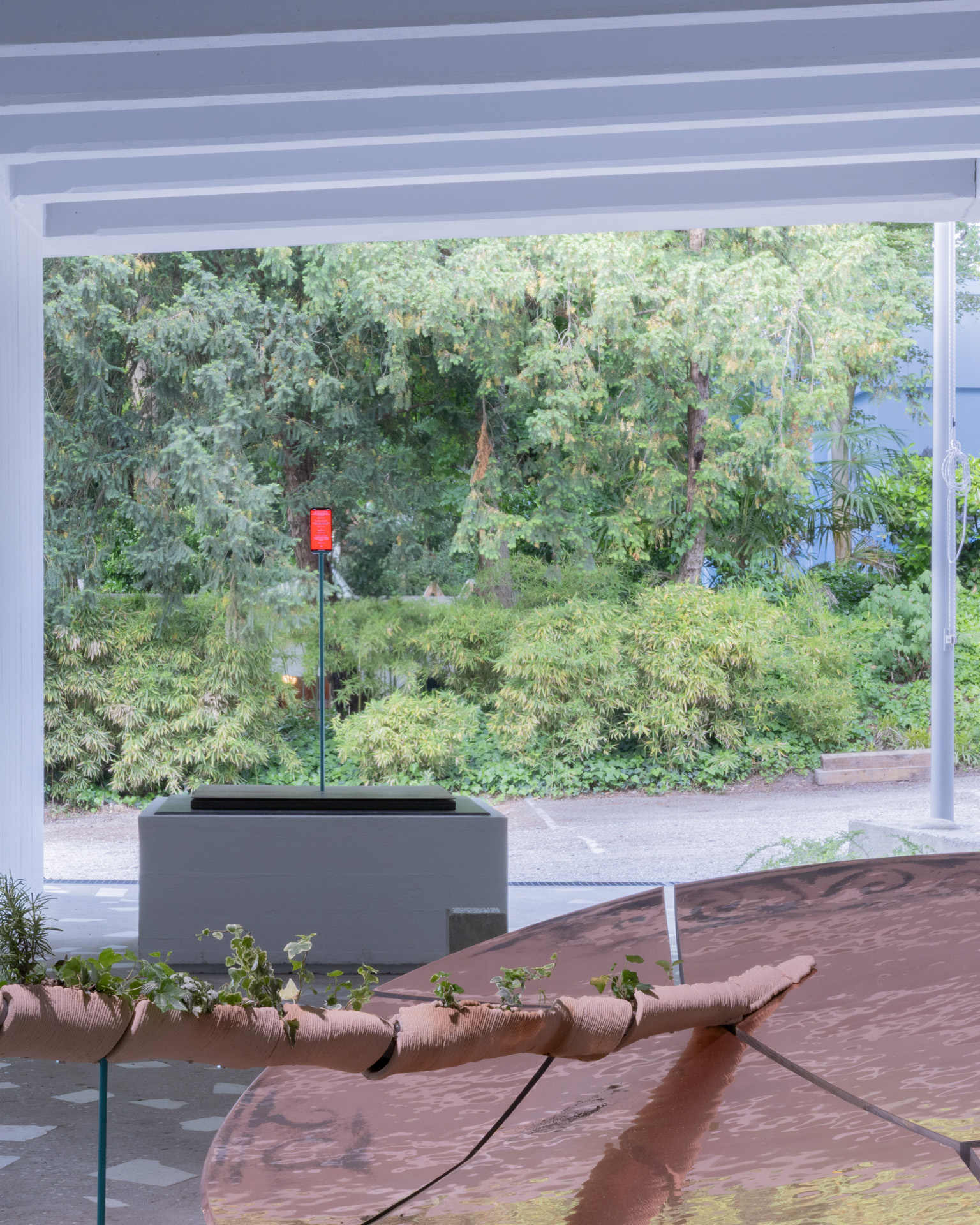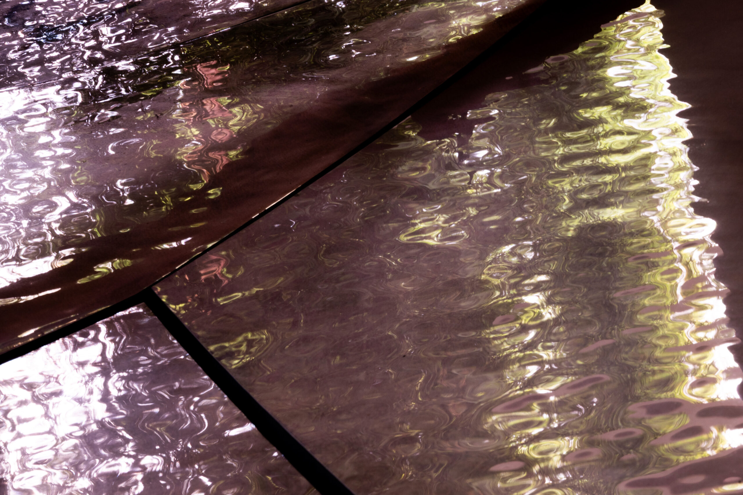 These elements are reinterpreted in a mirror-like finish with an organic patina pattern that bridges past and present, and also functions as a lighting element in the pilotis space, strategically reflecting the conical spotlight beam upward through a hole, casting its shadow onto the gallery ceiling.