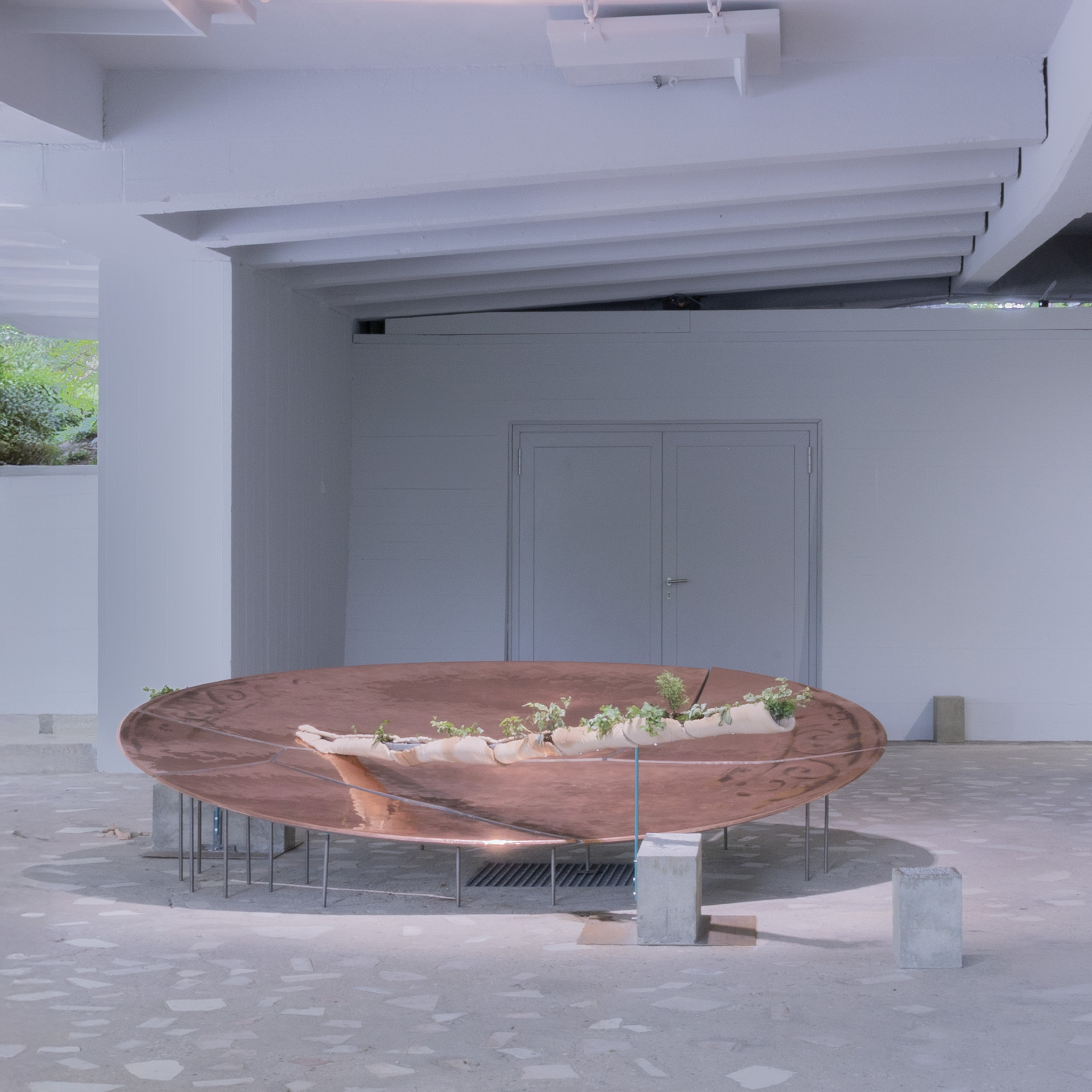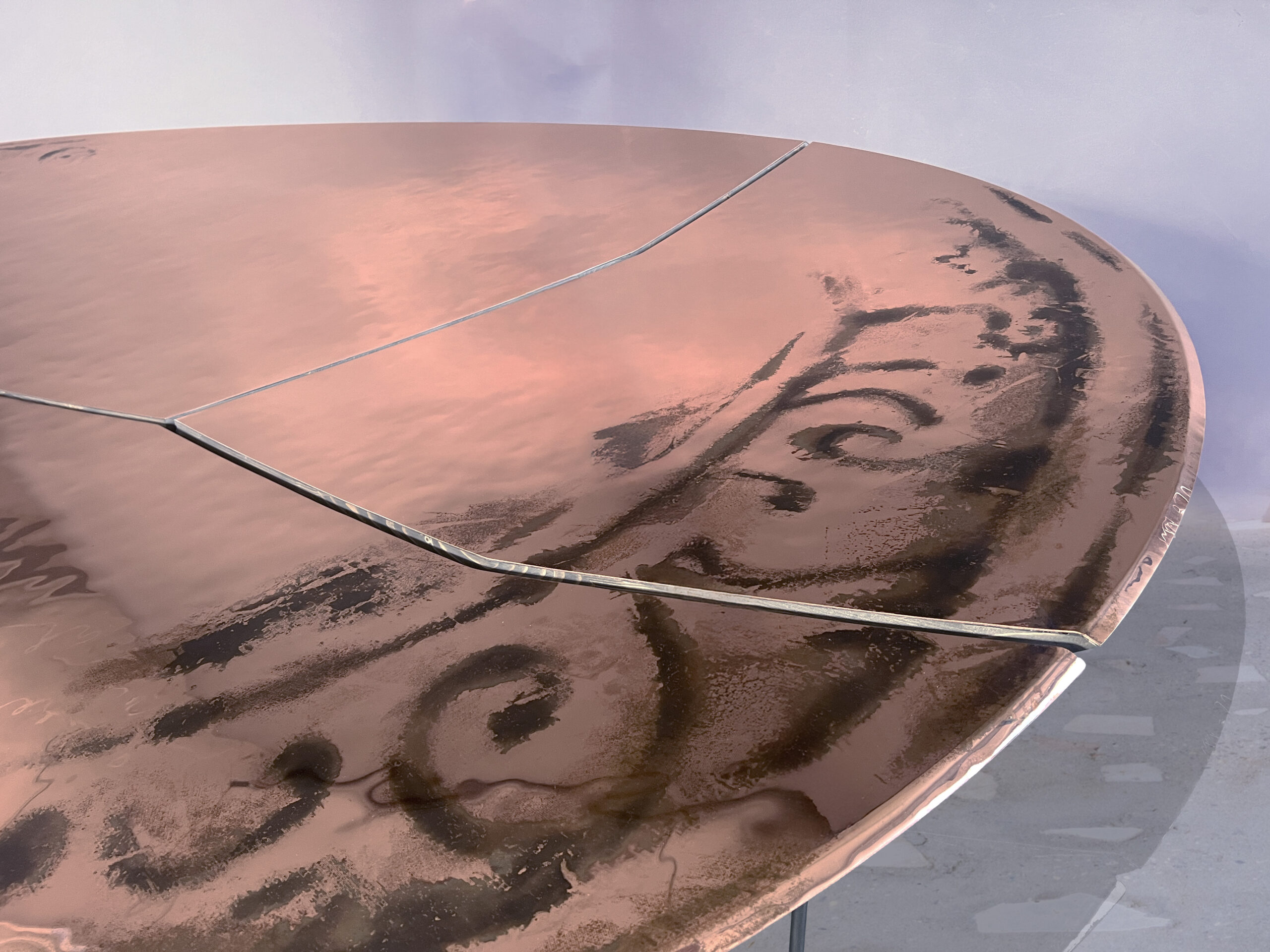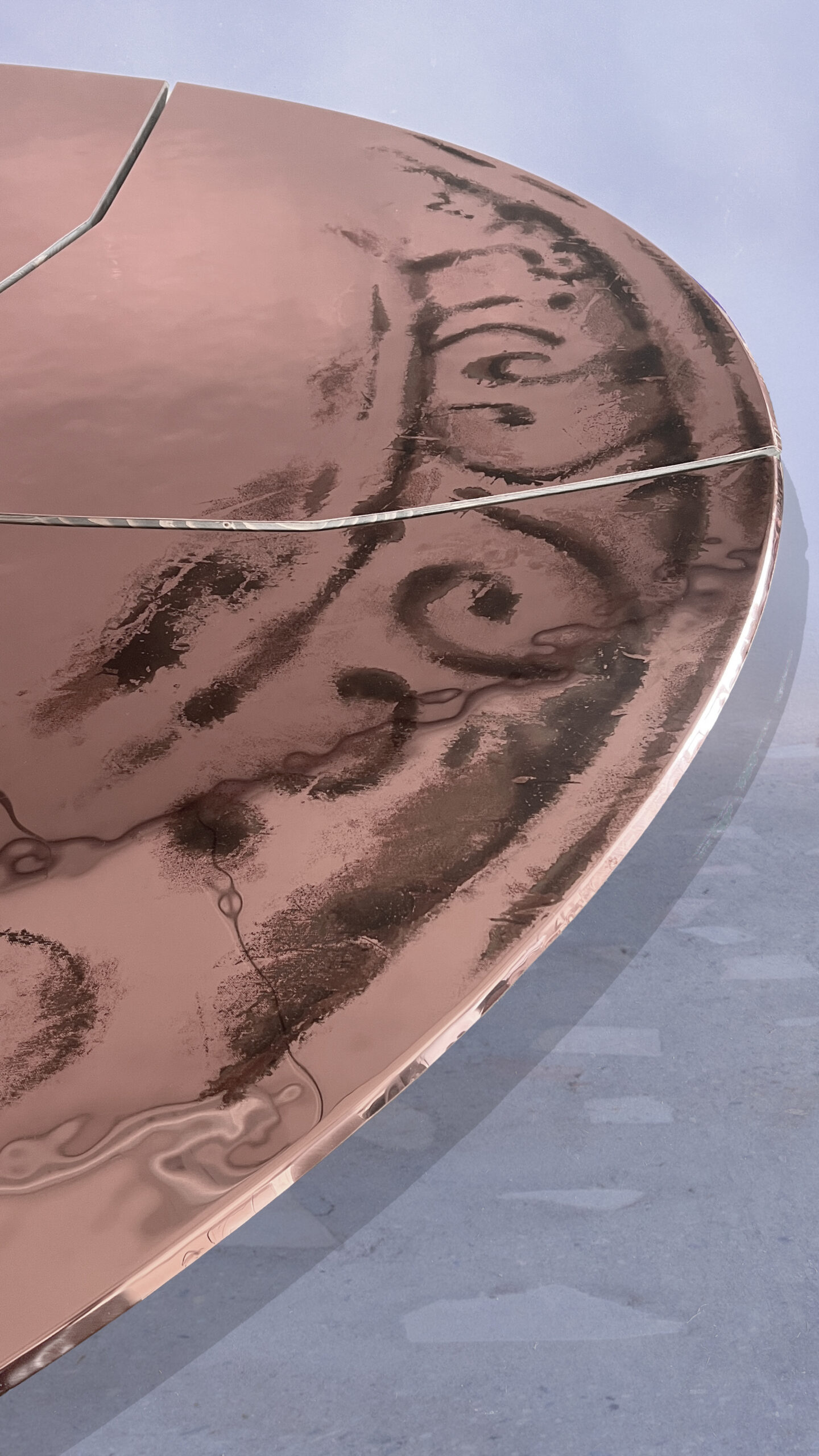 An enigmatic elliptical shape that follows the Japanese silver ratio, made from wood and steel, with a reflective copper surface with a complex double curvature and wavy finish on top.