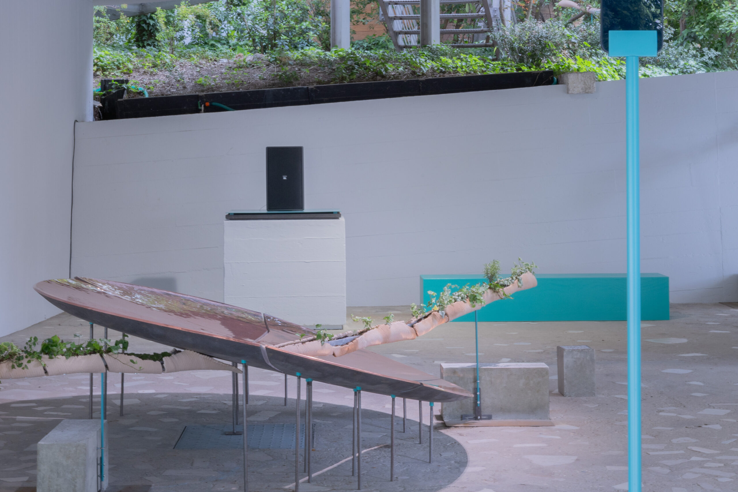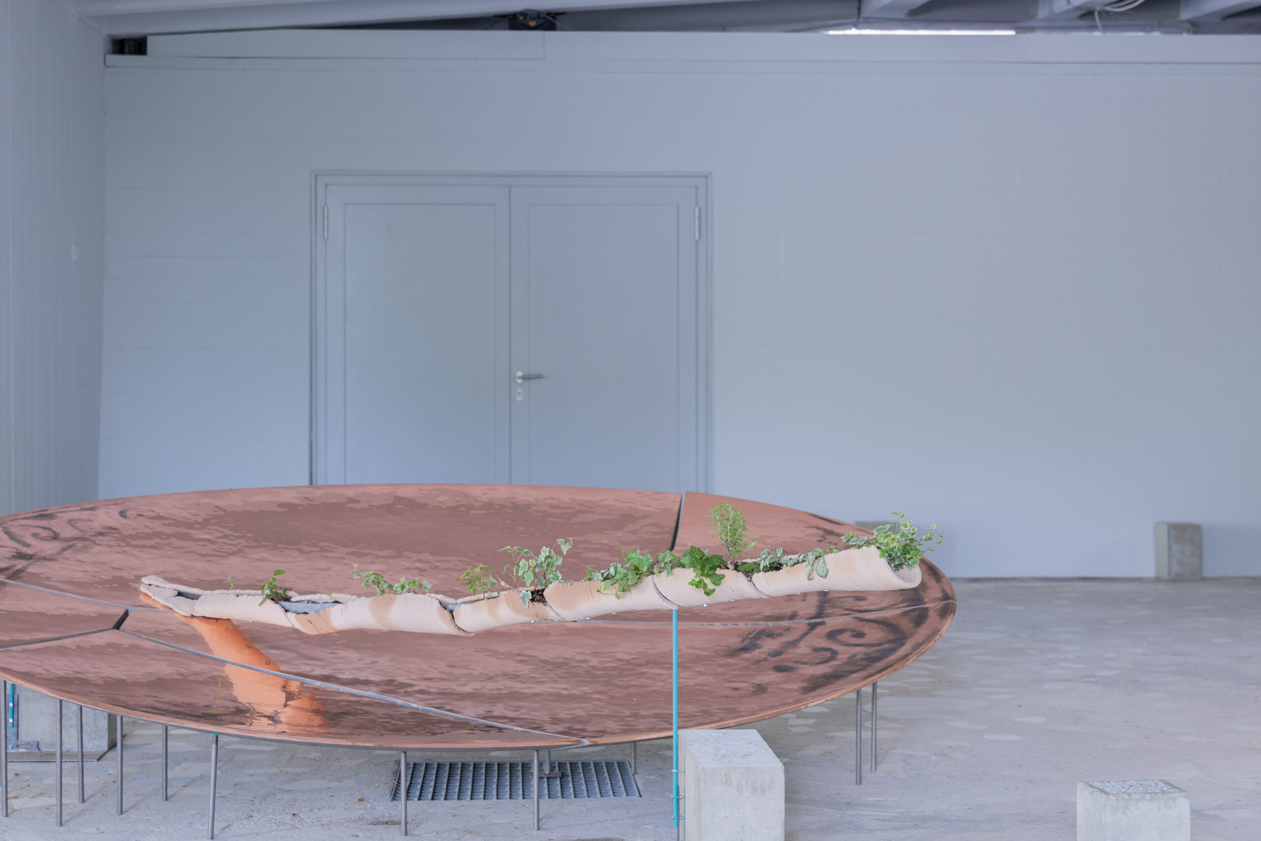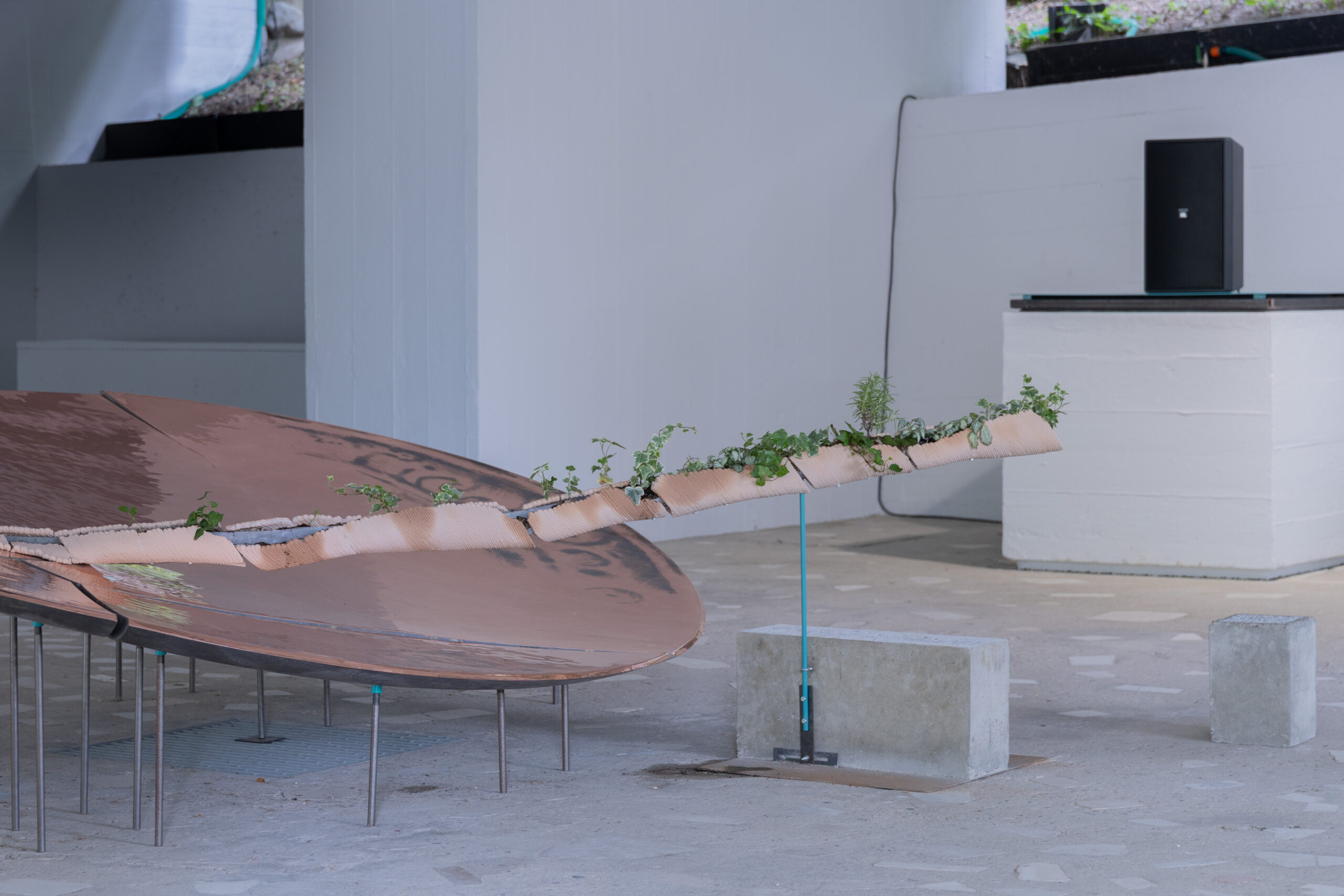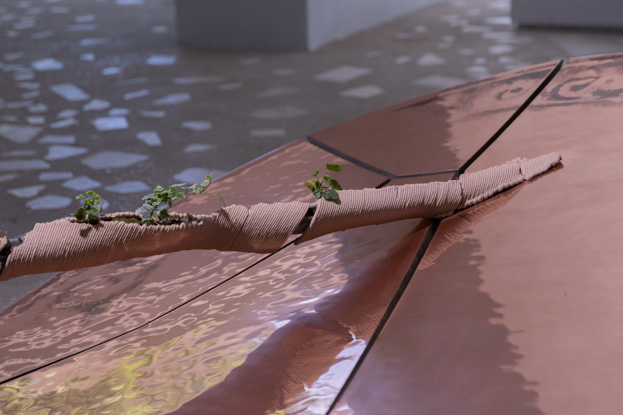 An enigmatic elliptical shape that follows the Japanese silver ratio, made from wood and steel, with a reflective copper surface with a complex double curvature and wavy finish on top.