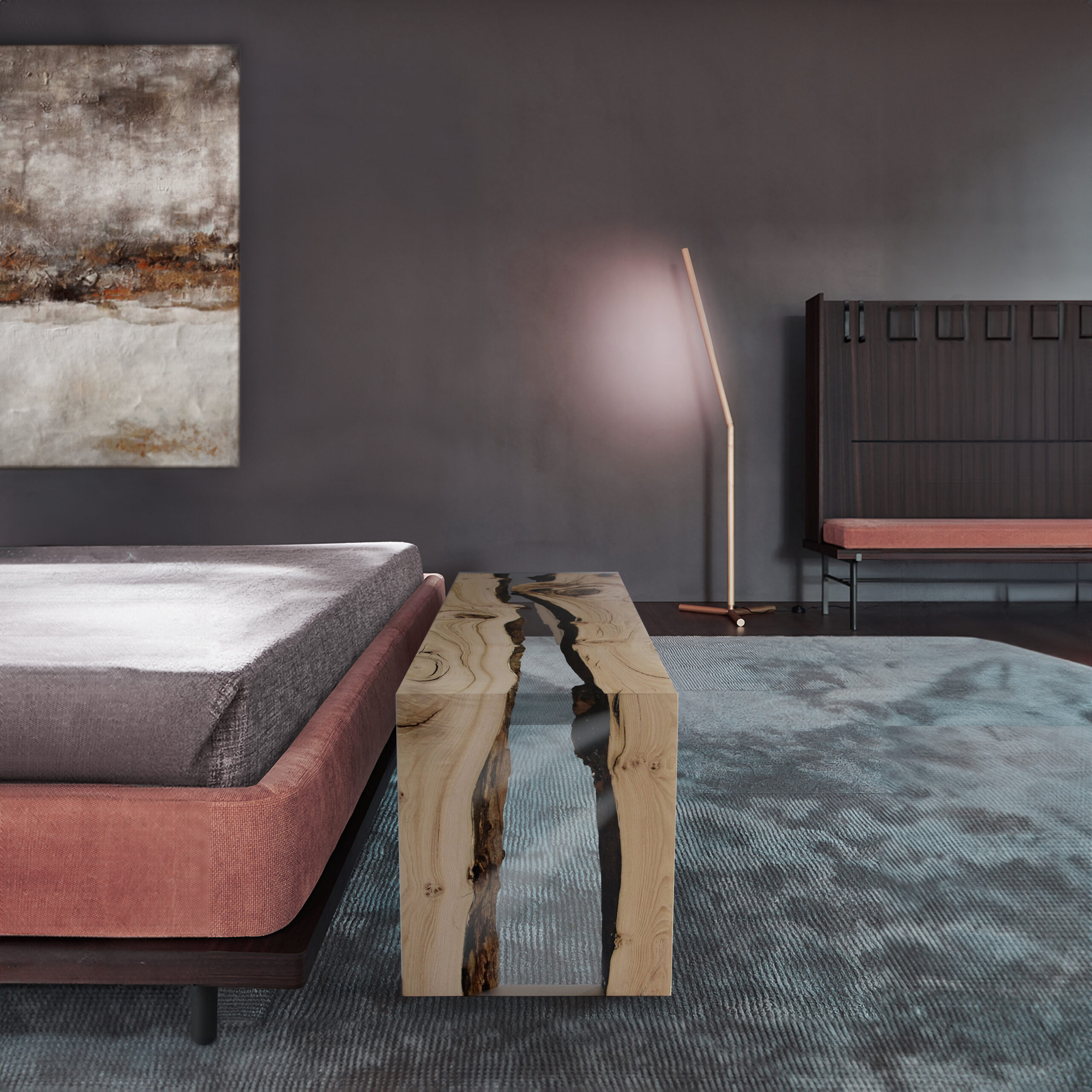 In Creek Bench the jagged edges of chestnut wood section planes look each other just like banks, separated by a sinous resin creek: a perfect recall of a Dolomites nature’s view.