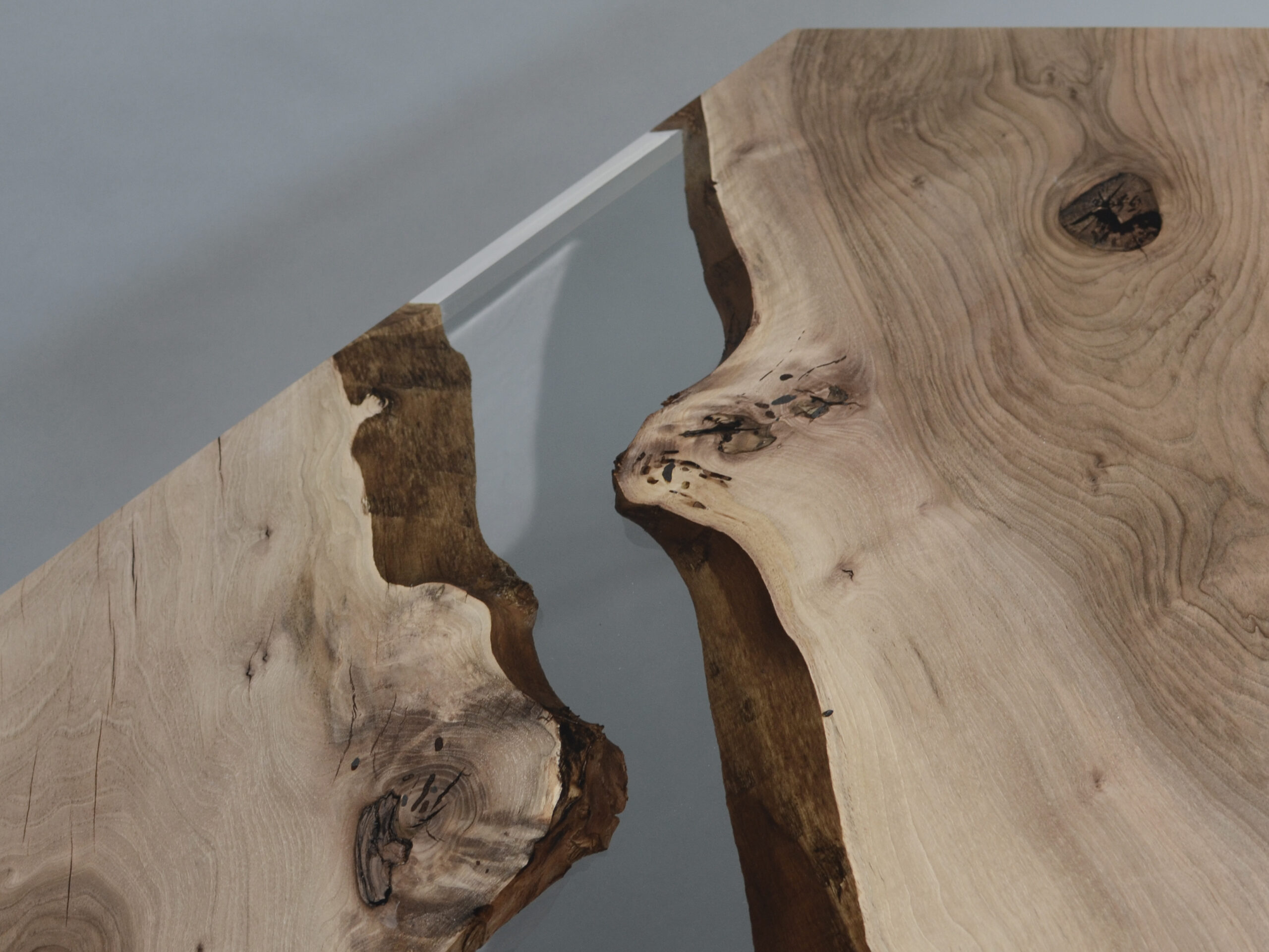 Crystal Walnut explores the encounter between organic imperfection and crystalline precision. The raw beauty of walnut wood — with its textured grain and live edges — emerges within a transparent volume shaped like a geometric prism.